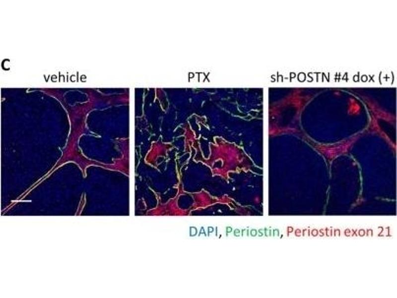 - Recombinant protein encompassing a sequence within the C-terminus region of human Periostin. The exact sequence is proprietary.
