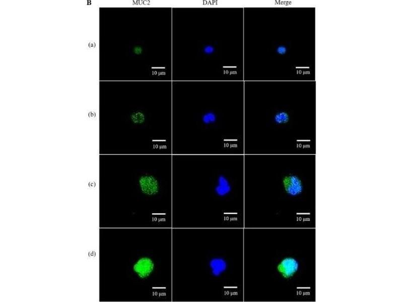 - Carrier-protein conjugated synthetic peptide encompassing a sequence within the C-terminus region of human MUC2. The exact sequence is proprietary.