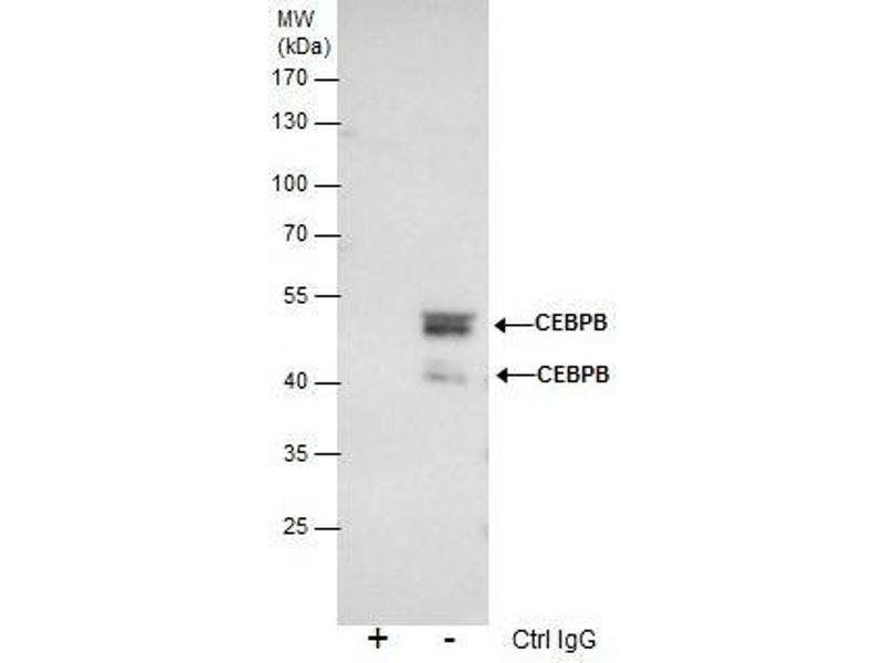 - Carrier-protein conjugated synthetic peptide encompassing a sequence within the N-terminus region of human C/EBP beta. The exact sequence is proprietary.