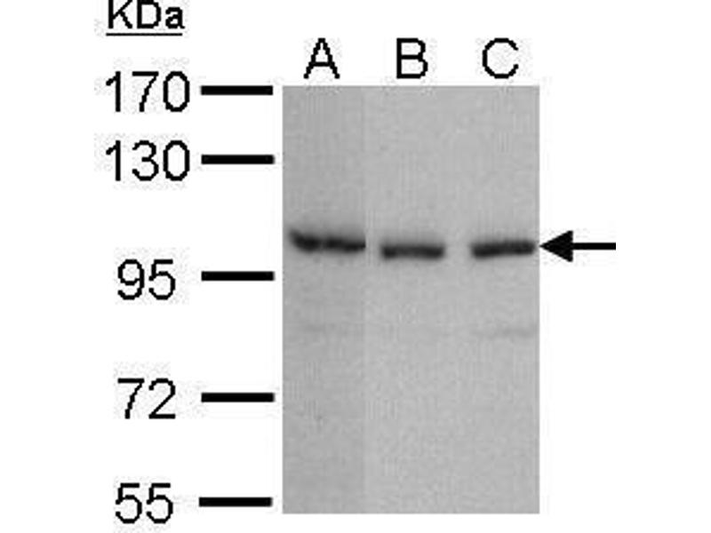 Carrier-protein conjugated synthetic peptide encompassing a sequence within the N-terminus region of human Tankyrase 2. The exact sequence is proprietary.