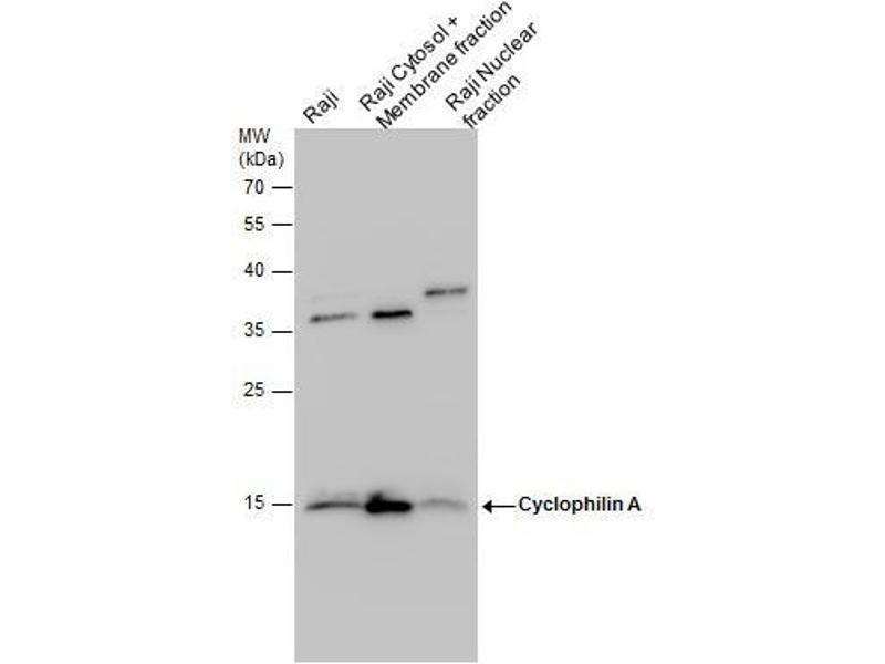 - Carrier-protein conjugated synthetic peptide encompassing a sequence within the C-terminus region of human Cyclophilin A. The exact sequence is proprietary.