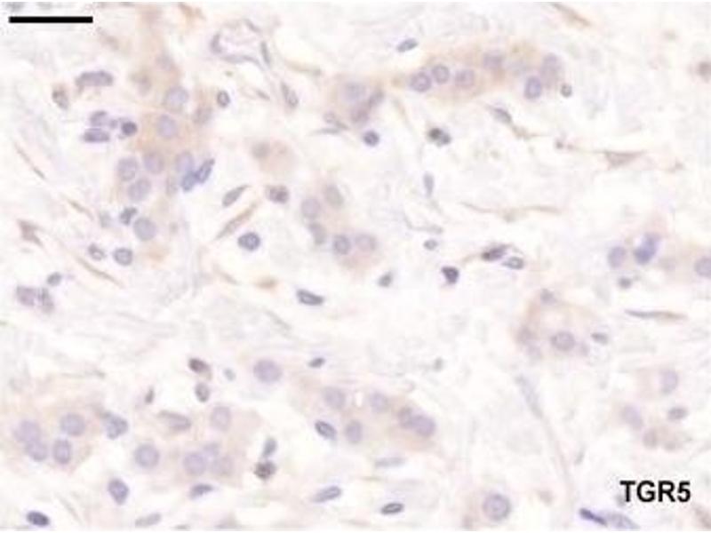 - Carrier-protein conjugated synthetic peptide encompassing a sequence within the C-terminus region of human TGR5. The exact sequence is proprietary.