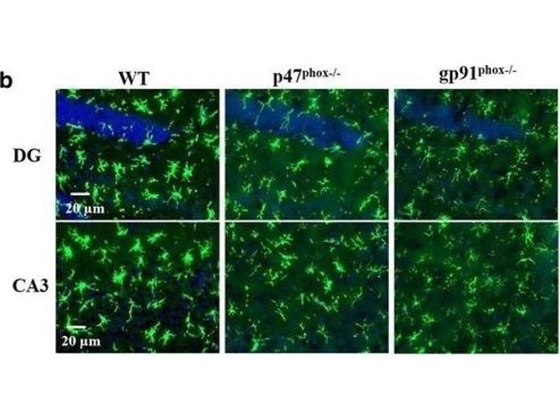 - Microglial cells in the brain of the CX3CR1 GFP mouse expressing GFP are known to express Aif-1. Immunostaining of the PFA fixed tissue sections with ABIN2857032 showed the expected co-localization of the GFP and Aif-1 signals.
