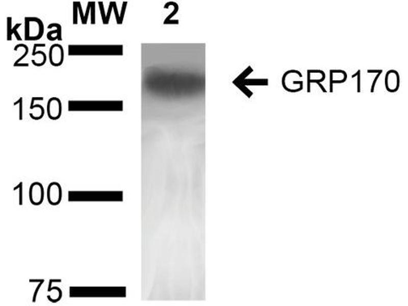 1 μg/ml of ABIN2868630 was sufficient for detection of GRP170 in 20 μg of HEK293 lysate by colorimetric immunoblot analysis using Goat anti-mouse IgG:HRP as the secondary antibody.