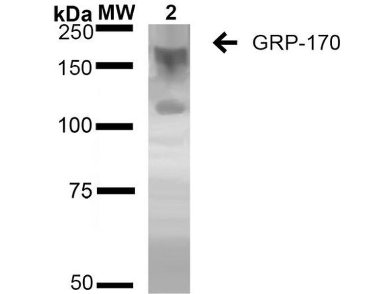 1 μg/ml of ABIN2868643 was sufficient for detection of GRP170 in 20 μg of HEK293 lysate by colorimetric immunoblot analysis using Goat anti-mouse IgG:HRP as the secondary antibody.
