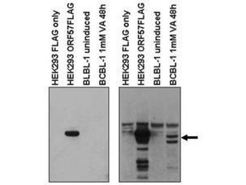 Usage: This affinity purified antibody has been tested for use in ELISA and western blotting. Specific conditions for reactivity should be optimized by the end user. Expect a band 50-55 kD in size corresponding to KSHV ORF57 protein by western blotting in the appropriate cell lysate or extract. -