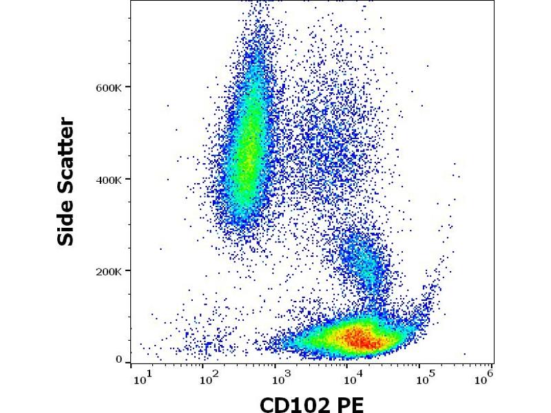Intercellular adhesion molecule 2,CD102 / ICAM-2 (intracellular cell adhesion molecule-2), a counter receptor of LFA-1 (CD11a/CD18), is a transmembrane glycoprotein with two extracellular IgC-like domains and intracellular C-terminal tail. It is involved in lymphocyte recirculation and homing to the sites of inflammation. Through interaction with integrins it provides to the immune cells costimulatory signals. Expression of CD102 on blood cells (lymphocytes, monocytes, thrombocytes) is lower than on endothelium and follicular dendritic cells. CD102 levels are upregulated in lymph nodes with malignant infiltration.,ICAM2