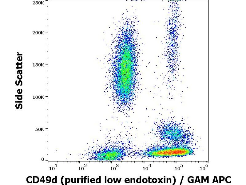 The mouse monoclonal antibody 9F10 recognizes an extracellular epitope of CD49d (alpha 4 integrin), a 145-180 kDa type I transmembrane glycoprotein expressed on B and T cells, monocytes, eosinophils, basophils, NK cells, and dendritic cells, but not platelets.