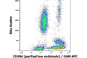 Integrin subunit alpha 4,CD49d / integrin alpha 4, unlike other alpha integrins, neither contains an I-domain, nor undergoes disulfide-linked cleavage. It associates with beta 7 chain to form alpha 4 / beta 7 integrin, and with beta 1 chain (CD29) to form VLA-4 integrin. These complexes are important for lymphocyte migration from circulation into tissue (binding VCAM-1) and homing of T cell subsets to Peyer´s patches (binding MadCAM-1), but VLA-4 is also target for invasive bacteria which contain invasin. CD49d is essential for differentiation and migration of hematopoietic stem cells by their adhesion to bone marrow stromal cells, and provides a costimulatory signal to TCR-CD3 complex by inducing phosphorylation of some focal adhesion proteins.,ITGA4, VLA-4 alpha