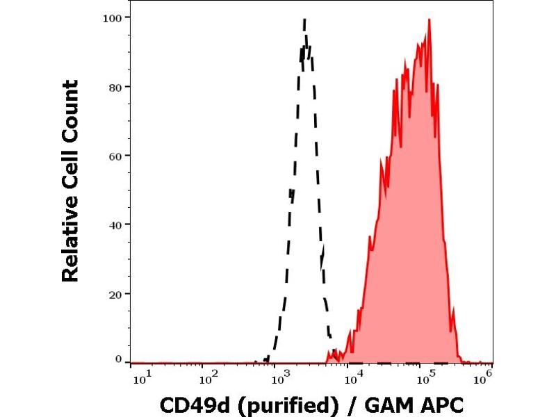 Integrin subunit alpha 4,CD49d / integrin alpha 4, unlike other alpha integrins, neither contains an I-domain, nor undergoes disulfide-linked cleavage. It associates with beta 7 chain to form alpha 4 / beta 7 integrin, and with beta 1 chain (CD29) to form VLA-4 integrin. These complexes are important for lymphocyte migration from circulation into tissue (binding VCAM-1) and homing of T cell subsets to Peyer´s patches (binding MadCAM-1), but VLA-4 is also target for invasive bacteria which contain invasin. CD49d is essential for differentiation and migration of hematopoietic stem cells by their adhesion to bone marrow stromal cells, and provides a costimulatory signal to TCR-CD3 complex by inducing phosphorylation of some focal adhesion proteins.,ITGA4, VLA-4 alpha