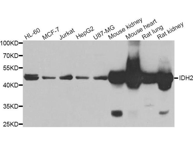 This Rabbit Polyclonal antibody specifically detects IDH2 in WB, IHC, IP, IF/ICC and ChIP. It exhibits reactivity toward Human, Mouse and Rat.