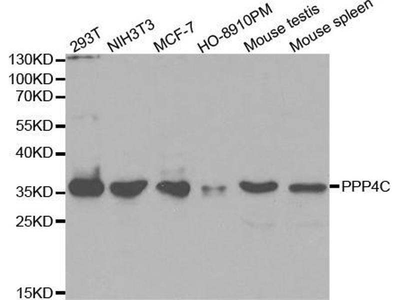 This Rabbit Polyclonal antibody specifically detects PPP4C in WB, IHC, IP and IF/ICC. It exhibits reactivity toward Human, Mouse and Rat.