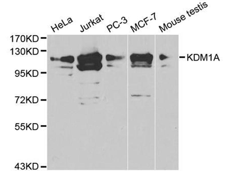 The Rabbit Polyclonal anti-LSD1 antibody is suitable to detect LSD1 in samples from Human and Mouse. It has been validated for WB, IP and IF/ICC.