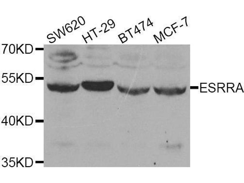 The protein encoded by this gene is a nuclear receptor that is closely related to the estrogen receptor. This protein acts as a site-specific transcription regulator and has been also shown to interact with estrogen and the transcripton factor TFIIB by direct protein-protein contact. The binding and regulatory activities of this protein have been demonstrated in the regulation of a variety of genes including lactoferrin, osteopontin, medium-chain acyl coenzyme A dehydrogenase (MCAD) and thyroid hormone receptor genes. A processed pseudogene of ESRRA is located on chromosome 13q12.1. Alternatively spliced transcript variants have been found for this gene.,ESRRA,ERR1,ERRa,ERRalpha,ESRL1,NR3B1,Epigenetics & Nuclear Signaling,Transcription Factors,Nuclear Receptor Signaling,Nuclear hormone receptors,Cancer,Signal Transduction,Endocrine & Metabolism,Mitochondrial metabolism,Mitochondrial Biogenesis,Nucleotide metabolism,Molecular processes,ESRRA