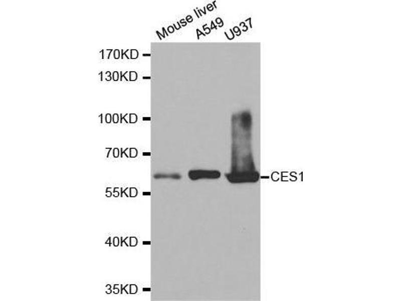 This gene encodes a member of the carboxylesterase large family. The family members are responsible for the hydrolysis or transesterification of various xenobiotics, such as cocaine and heroin, and endogenous substrates with ester, thioester, or amide bonds. They may participate in fatty acyl and cholesterol ester metabolism, and may play a role in the blood-brain barrier system. This enzyme is the major liver enzyme and functions in liver drug clearance. Mutations of this gene cause carboxylesterase 1 deficiency. Three transcript variants encoding three different isoforms have been found for this gene.,CES1,ACAT,CE-1,CEH,CES2,HMSE,HMSE1,PCE-1,REH,SES1,TGH,hCE-1,Cancer,Signal Transduction,Endocrine & Metabolism,Lipid Metabolism,Cholesterol Metabolism,Hydrolysis,Drug metabolism,Immunology & Inflammation,CD markers,Cardiovascular,Lipids,CES1