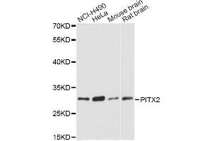 This gene encodes a member of the RIEG/PITX homeobox family, which is in the bicoid class of homeodomain proteins. The encoded protein acts as a transcription factor and regulates procollagen lysyl hydroxylase gene expression. This protein plays a role in the terminal differentiation of somatotroph and lactotroph cell phenotypes, is involved in the development of the eye, tooth and abdominal organs, and acts as a transcriptional regulator involved in basal and hormone-regulated activity of prolactin. Mutations in this gene are associated with Axenfeld-Rieger syndrome, iridogoniodysgenesis syndrome, and sporadic cases of Peters anomaly. A similar protein in other vertebrates is involved in the determination of left-right asymmetry during development. Alternatively spliced transcript variants encoding distinct isoforms have been described.,PITX2,ARP1,ASGD4,Brx1,IDG2,IGDS,IGDS2,IHG2,IRID2,Otlx2,PTX2,RGS,RIEG,RIEG1,RS,Epigenetics & Nuclear Signaling,Transcription Factors,Cell Biology & Developmental Biology,Cardiovascular,Heart,Cardiogenesis,PITX2