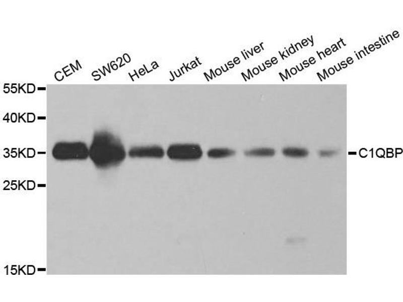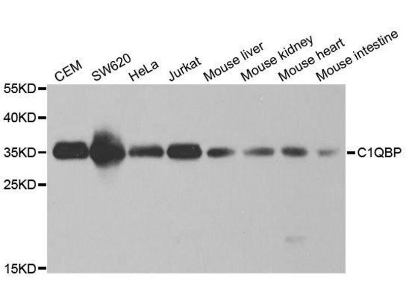 The human complement subcomponent C1q associates with C1r and C1s in order to yield the first component of the serum complement system. The protein encoded by this gene is known to bind to the globular heads of C1q molecules and inhibit C1 activation. This protein has also been identified as the p32 subunit of pre-mRNA splicing factor SF2, as well as a hyaluronic acid-binding protein.,C1QBP,GC1QBP,HABP1,SF2p32,gC1Q-R,gC1qR,p32,Immunology & Inflammation,Cell Intrinsic Innate Immunity Signaling Pathway,C1QBP