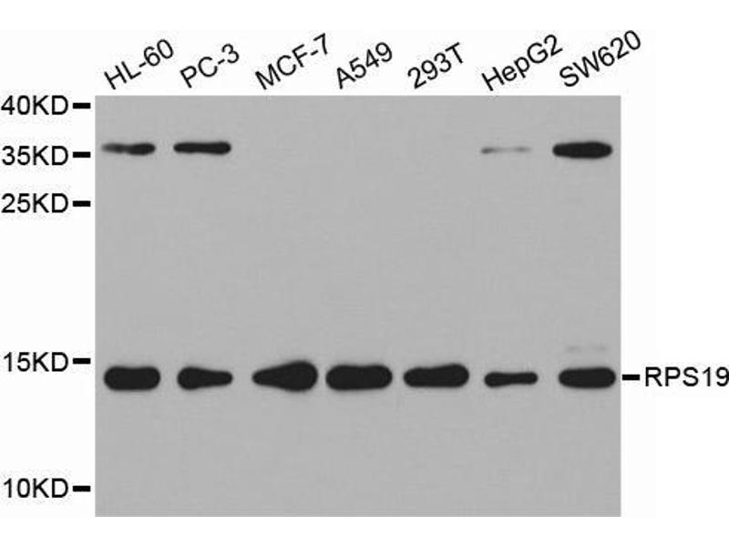 Ribosomes, the organelles that catalyze protein synthesis, consist of a small 40S subunit and a large 60S subunit. Together these subunits are composed of 4 RNA species and approximately 80 structurally distinct proteins. This gene encodes a ribosomal protein that is a component of the 40S subunit. The protein belongs to the S19E family of ribosomal proteins. It is located in the cytoplasm. Mutations in this gene cause Diamond-Blackfan anemia (DBA), a constitutional erythroblastopenia characterized by absent or decreased erythroid precursors, in a subset of patients. This suggests a possible extra-ribosomal function for this gene in erythropoietic differentiation and proliferation, in addition to its ribosomal function. Higher expression levels of this gene in some primary colon carcinomas compared to matched normal colon tissues has been observed. As is typical for genes encoding ribosomal proteins, there are multiple processed pseudogenes of this gene dispersed through the genome.,RPS19,DBA,DBA1,S19,Epigenetics & Nuclear Signaling,RPS19