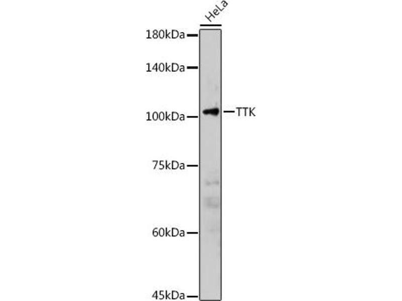 This gene encodes a dual specificity protein kinase with the ability to phosphorylate tyrosine, serine and threonine. Associated with cell proliferation, this protein is essential for chromosome alignment at the centromere during mitosis and is required for centrosome duplication. It has been found to be a critical mitotic checkpoint protein for accurate segregation of chromosomes during mitosis. Tumorigenesis may occur when this protein fails to degrade and produces excess centrosomes resulting in aberrant mitotic spindles. Alternative splicing results in multiple transcript variants.,TTK,CT96,ESK,MPH1,MPS1,MPS1L1,PYT,Epigenetics & Nuclear Signaling,Signal Transduction,Kinase,Cell Biology & Developmental Biology,Apoptosis,Cell Cycle,Centromere,TTK