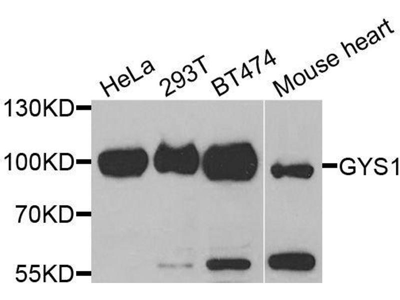 The protein encoded by this gene catalyzes the addition of glucose monomers to the growing glycogen molecule through the formation of alpha-1,4-glycoside linkages. Mutations in this gene are associated with muscle glycogen storage disease. Alternatively spliced transcript variants encoding different isoforms have been found for this gene.,GYS1,GSY,GYS,Cancer,Signal Transduction,PI3K-Akt Signaling Pathway,Cell Biology & Developmental Biology,Cytoskeleton,Actins,Endocrine & Metabolism,Carbohydrate metabolism,AMPK Signaling Pathway,Insulin Receptor Signaling Pathway,Endocrine and metabolic diseases,Diabetes,Obesity,Cardiovascular,Heart,Cardiovascular diseases,Heart disease,GYS1