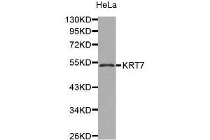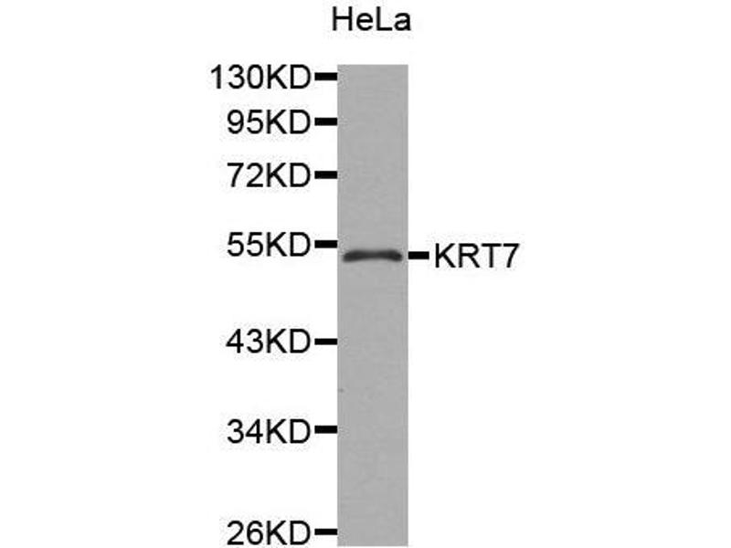 The protein encoded by this gene is a member of the keratin gene family. The type II cytokeratins consist of basic or neutral proteins which are arranged in pairs of heterotypic keratin chains coexpressed during differentiation of simple and stratified epithelial tissues. This type II cytokeratin is specifically expressed in the simple epithelia lining the cavities of the internal organs and in the gland ducts and blood vessels. The genes encoding the type II cytokeratins are clustered in a region of chromosome 12q12-q13. Alternative splicing may result in several transcript variants, however, not all variants have been fully described.,KRT7,CK7,K2C7,K7,SCL,keratin 7,Keratin,Signal Transduction,Cell Biology & Developmental Biology,Cytoskeleton,Intermediate Filaments,Extracellular Matrix,Cytokeratin,Keratin,KRT7