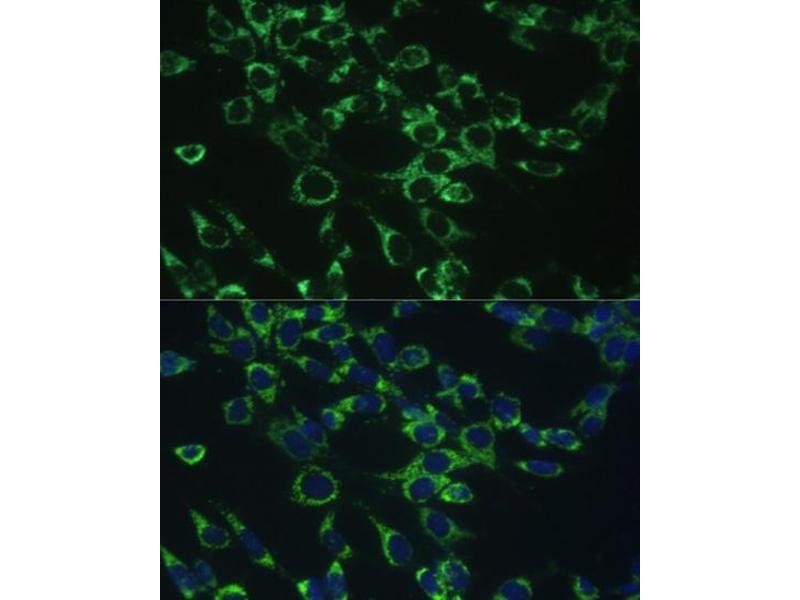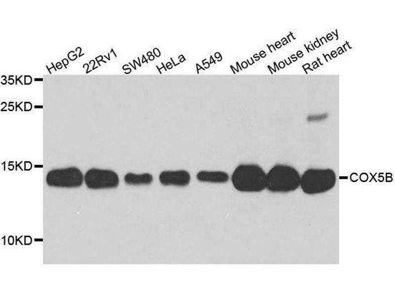 Cytochrome C oxidase (COX) is the terminal enzyme of the mitochondrial respiratory chain. It is a multi-subunit enzyme complex that couples the transfer of electrons from cytochrome c to molecular oxygen and contributes to a proton electrochemical gradient across the inner mitochondrial membrane. The complex consists of 13 mitochondrial- and nuclear-encoded subunits. The mitochondrially-encoded subunits perform the electron transfer and proton pumping activities. The functions of the nuclear-encoded subunits are unknown but they may play a role in the regulation and assembly of the complex. This gene encodes the nuclear-encoded subunit Vb of the human mitochondrial respiratory chain enzyme.,COX5B,COXVB,Cancer,Signal Transduction,Endocrine & Metabolism,Mitochondrial metabolism,Mitochondrial markers,Oxidative phosphorylation,Neuroscience,Neurodegenerative Diseases,COX5B