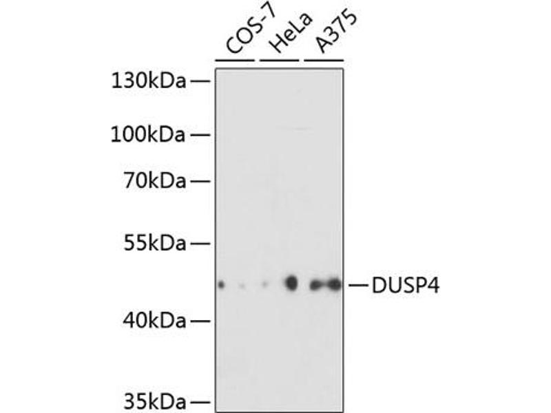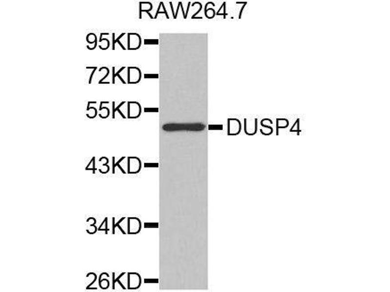The protein encoded by this gene is a member of the dual specificity protein phosphatase subfamily. These phosphatases inactivate their target kinases by dephosphorylating both the phosphoserine/threonine and phosphotyrosine residues. They negatively regulate members of the mitogen-activated protein (MAP) kinase superfamily (MAPK/ERK, SAPK/JNK, p38), which are associated with cellular proliferation and differentiation. Different members of the family of dual specificity phosphatases show distinct substrate specificities for various MAP kinases, different tissue distribution and subcellular localization, and different modes of inducibility of their expression by extracellular stimuli. This gene product inactivates ERK1, ERK2 and JNK, is expressed in a variety of tissues, and is localized in the nucleus. Two alternatively spliced transcript variants, encoding distinct isoforms, have been observed for this gene. In addition, multiple polyadenylation sites have been reported.,DUSP4,HVH2,MKP-2,MKP2,TYP,Signal Transduction,Kinase,MAPK-Erk Signaling Pathway,MAPK-JNK Signaling Pathway,Cell Biology & Developmental Biology,Cell Cycle,Immunology & Inflammation,DUSP4