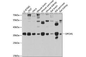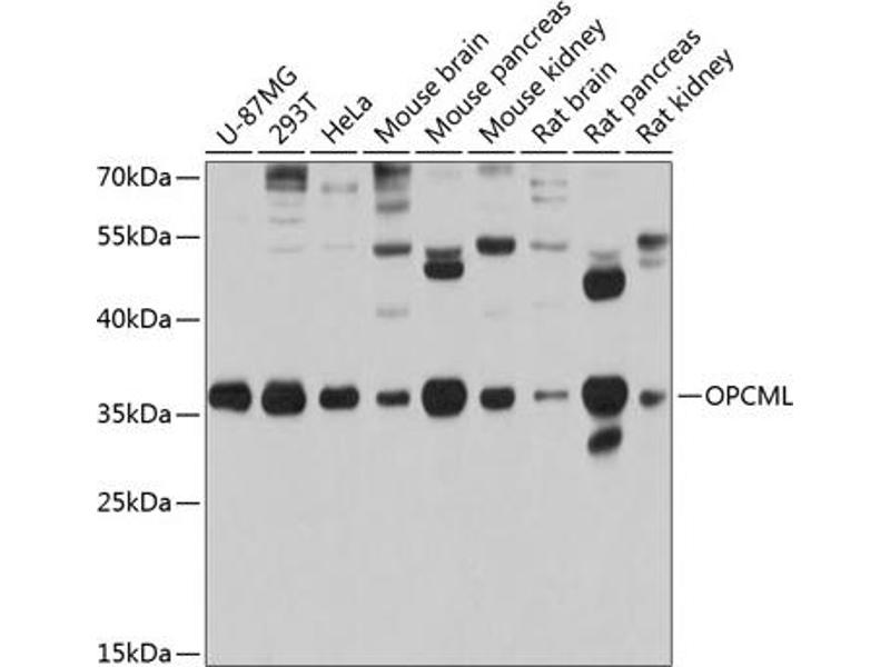 This gene encodes a member of the IgLON subfamily in the immunoglobulin protein superfamily of proteins. The encoded preprotein is proteolytically processed to generate the mature protein. This protein is localized in the plasma membrane and may have an accessory role in opioid receptor function. This gene has an ortholog in rat and bovine. The opioid binding-cell adhesion molecule encoded by the rat gene binds opioid alkaloids in the presence of acidic lipids, exhibits selectivity for mu ligands and acts as a GPI-anchored protein. Since the encoded protein is highly conserved in species during evolution, it may have a fundamental role in mammalian systems. Alternative splicing results in multiple transcript variants, at least one of which encodes an isoform that is proteolytically processed.,OPCML,IGLON1,OBCAM,OPCM,Cancer,Tumor suppressors,Signal Transduction,G protein signaling,G-Protein-Coupled Receptors(GPCR),Cell Biology & Developmental Biology,Cell Adhesion,Neuroscience,OPCML
