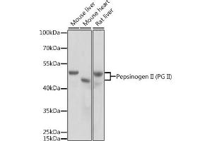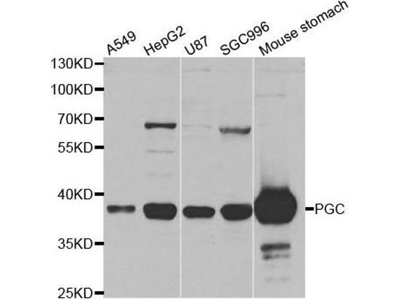 This gene encodes an aspartic proteinase that belongs to the peptidase family A1. The encoded protein is a digestive enzyme that is produced in the stomach and constitutes a major component of the gastric mucosa. This protein is also secreted into the serum. This protein is synthesized as an inactive zymogen that includes a highly basic prosegment. This enzyme is converted into its active mature form at low pH by sequential cleavage of the prosegment that is carried out by the enzyme itself. Polymorphisms in this gene are associated with susceptibility to gastric cancers. Serum levels of this enzyme are used as a biomarker for certain gastric diseases including Helicobacter pylori related gastritis. Alternate splicing results in multiple transcript variants. A pseudogene of this gene is found on chromosome 1.,PGC,PEPC,PGII,gastricsin,Cancer,Tumor biomarkers,Signal Transduction,Endocrine & Metabolism,Amino acid metabolism,PGC