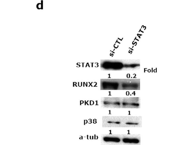 This gene is a member of the RUNX family of transcription factors and encodes a nuclear protein with an Runt DNA-binding domain. This protein is essential for osteoblastic differentiation and skeletal morphogenesis and acts as a scaffold for nucleic acids and regulatory factors involved in skeletal gene expression. The protein can bind DNA both as a monomer or, with more affinity, as a subunit of a heterodimeric complex. Two regions of potential trinucleotide repeat expansions are present in the N-terminal region of the encoded protein, and these and other mutations in this gene have been associated with the bone development disorder cleidocranial dysplasia (CCD). Transcript variants that encode different protein isoforms result from the use of alternate promoters as well as alternate splicing.,RUNX2,AML3,CBF-alpha-1,CBFA1,CCD,CCD1,CLCD,OSF-2,OSF2,PEA2aA,PEBP2aA,Epigenetics & Nuclear Signaling,Transcription Factors,Cell Biology & Developmental Biology,Extracellular Matrix,Bone,Hippo Signaling Pathway,Stem Cells,Mesenchymal Stem Cells,Target gene,RUNX2