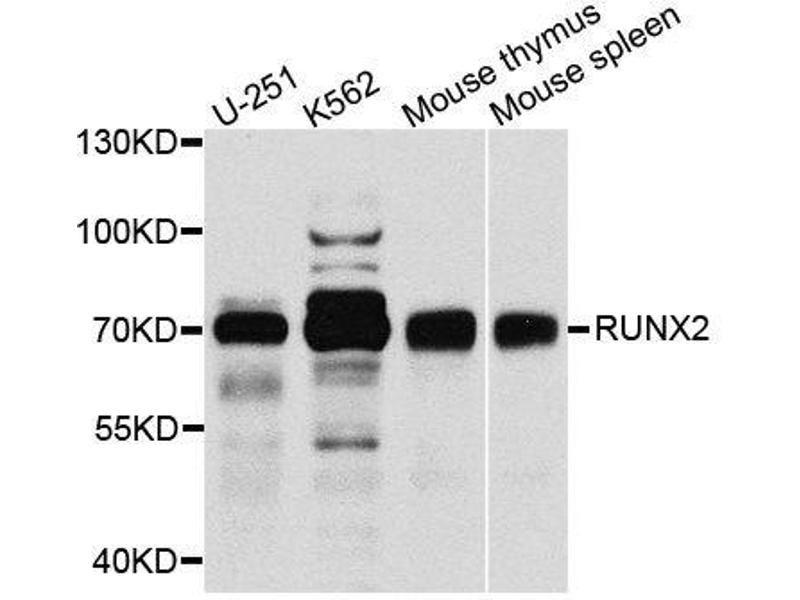 The Rabbit Polyclonal anti-RUNX2 antibody (ABIN3016834) specifically detects RUNX2 in WB, IHC and IF.