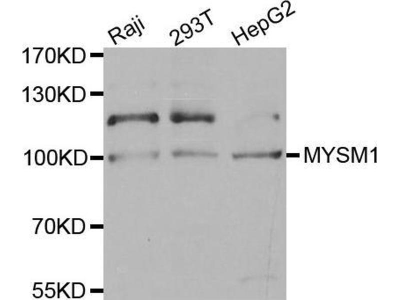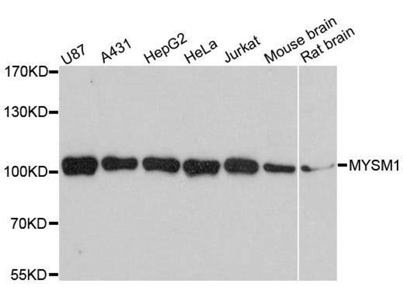 Metalloprotease that specifically deubiquitinates monoubiquitinated histone H2A, a specific tag for epigenetic transcriptional repression, thereby acting as a coactivator. Preferentially deubiquitinates monoubiquitinated H2A in hyperacetylated nucleosomes. Deubiquitination of histone H2A leads to facilitate the phosphorylation and dissociation of histone H1 from the nucleosome. Acts as a coactivator by participating in the initiation and elongation steps of androgen receptor (AR)-induced gene activation.,MYSM1,2A-DUB,2ADUB,Epigenetics & Nuclear Signaling,Cell Biology & Developmental Biology,Ubiquitin,MYSM1