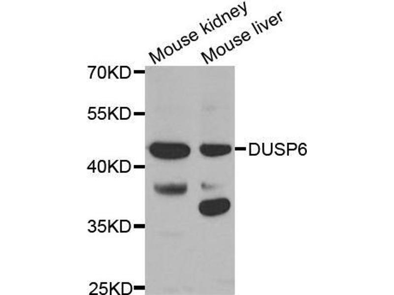 The protein encoded by this gene is a member of the dual specificity protein phosphatase subfamily. These phosphatases inactivate their target kinases by dephosphorylating both the phosphoserine/threonine and phosphotyrosine residues. They negatively regulate members of the mitogen-activated protein (MAP) kinase superfamily (MAPK/ERK, SAPK/JNK, p38), which are associated with cellular proliferation and differentiation. Different members of the family of dual specificity phosphatases show distinct substrate specificities for various MAP kinases, different tissue distribution and subcellular localization, and different modes of inducibility of their expression by extracellular stimuli. This gene product inactivates ERK2, is expressed in a variety of tissues with the highest levels in heart and pancreas, and unlike most other members of this family, is localized in the cytoplasm. Mutations in this gene have been associated with congenital hypogonadotropic hypogonadism. Alternatively spliced transcript variants have been found for this gene.,DUSP6,HH19,MKP3,PYST1,Signal Transduction,G protein signaling,G2/M DNA Damage Checkpoint,Kinase,MAPK-Erk Signaling Pathway,MAPK-JNK Signaling Pathway,Immunology & Inflammation,Neuroscience,DUSP6
