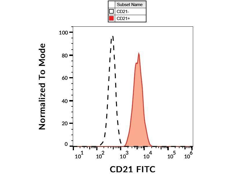 The antibody LT21 reacts with an extracellular epitope of CD21 (CR2), a 145 kDa transmembrane glycoprotein (complement C3d receptor - C3dR) expressed on B lymphocytes, follicular dendritic cells, some epithelial cells and a subsets of T lymphocytes. It is not expressed on immature B cells.