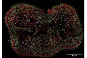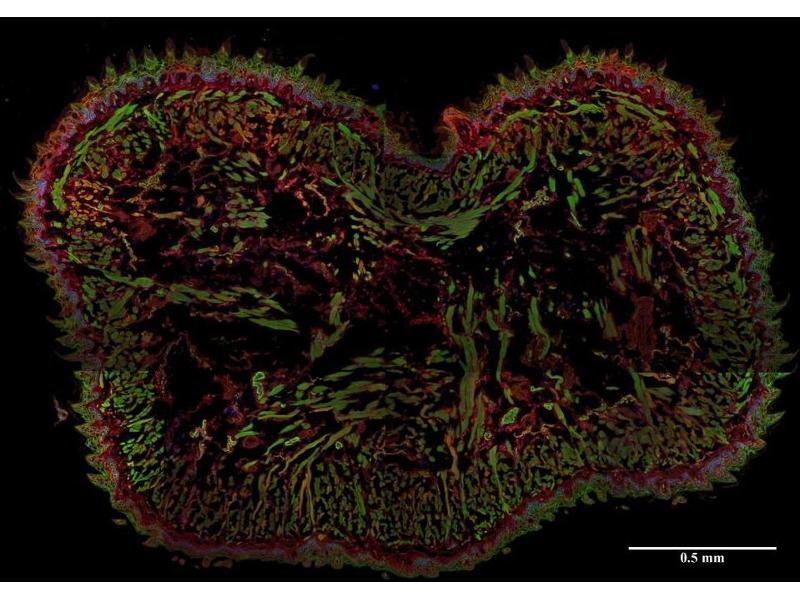 The mouse monoclonal antibody EM-09 reacts with AHNAK1, a 700 kDa multi-functional adaptor protein expressed mainly in epithelial cell, various types of muscle cells and immune cells.