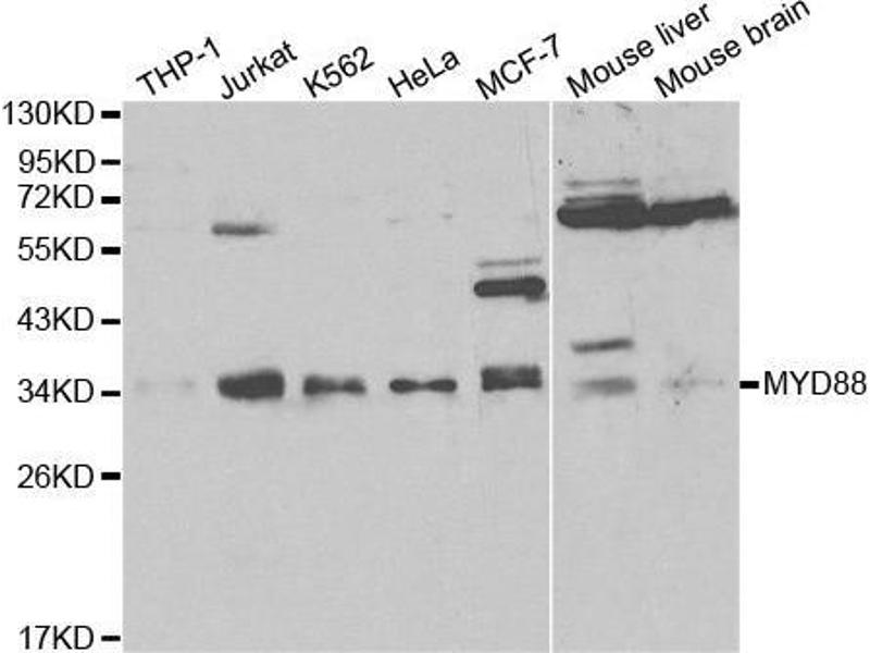 This gene encodes a cytosolic adapter protein that plays a central role in the innate and adaptive immune response. This protein functions as an essential signal transducer in the interleukin-1 and Toll-like receptor signaling pathways. These pathways regulate that activation of numerous proinflammatory genes. The encoded protein consists of an N-terminal death domain and a C-terminal Toll-interleukin1 receptor domain. Patients with defects in this gene have an increased susceptibility to pyogenic bacterial infections. Alternate splicing results in multiple transcript variants.,MYD88,MYD88D,myeloid differentiation primary response 88,MyD88,Signal Transduction,Immunology & Inflammation,NF-kB Signaling Pathway,Toll-like Receptor Signaling Pathway,Cell Intrinsic Innate Immunity Signaling Pathway,TLR Signaling,Cardiovascular,MYD88