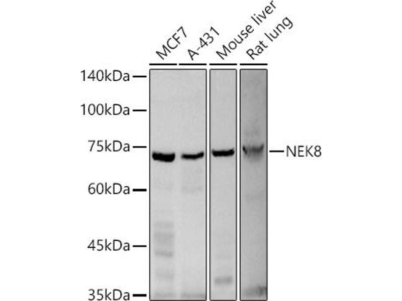 This gene encodes a member of the serine/threionine protein kinase family related to NIMA (never in mitosis, gene A) of Aspergillus nidulans. The encoded protein may play a role in cell cycle progression from G2 to M phase. Mutations in the related mouse gene are associated with a disease phenotype that closely parallels the juvenile autosomal recessive form of polycystic kidney disease in humans.,NEK8,JCK,NEK12A,NPHP9,RHPD2,Epigenetics & Nuclear Signaling,Signal Transduction,Kinase,Cell Biology & Developmental Biology,Cell Cycle,Centrosome,NEK8