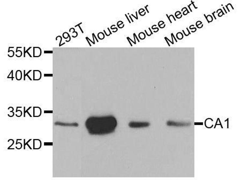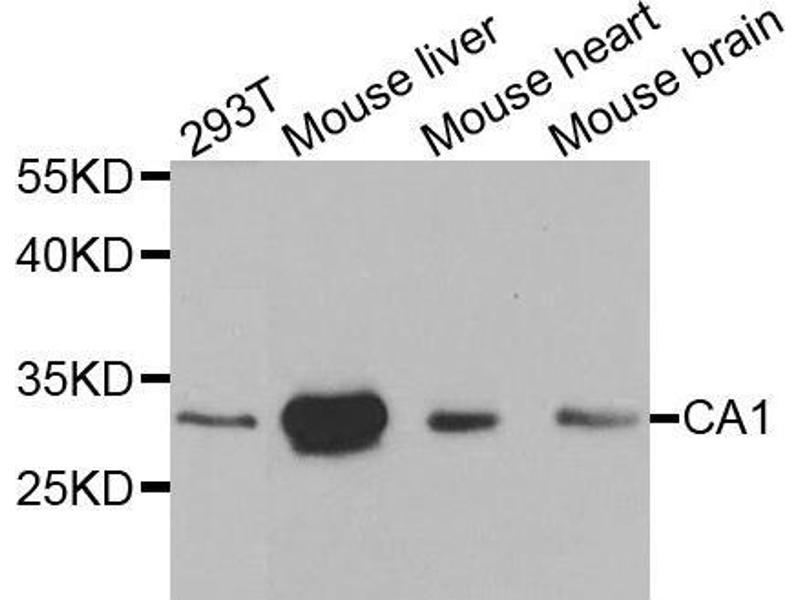 Carbonic anhydrases (CAs) are a large family of zinc metalloenzymes that catalyze the reversible hydration of carbon dioxide. They participate in a variety of biological processes, including respiration, calcification, acid-base balance, bone resorption, and the formation of aqueous humor, cerebrospinal fluid, saliva and gastric acid. They show extensive diversity in tissue distribution and in their subcellular localization. This CA1 gene is closely linked to the CA2 and CA3 genes on chromosome 8. It encodes a cytosolic protein that is found at the highest level in erythrocytes. Allelic variants of this gene have been described in some populations. Alternative splicing and the use of alternative promoters results in multiple transcript variants.,CA1,CA-I,CAB,Car1,HEL-S-11,Cell Biology & Developmental Biology,Cardiovascular,Blood,CA1
