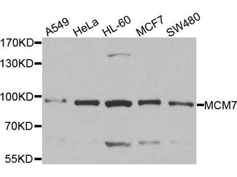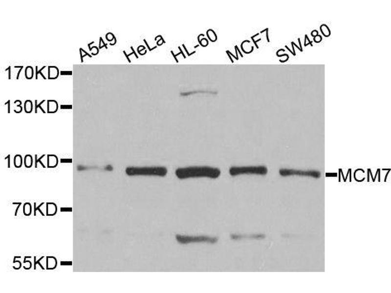 The protein encoded by this gene is one of the highly conserved mini-chromosome maintenance proteins (MCM) that are essential for the initiation of eukaryotic genome replication. The hexameric protein complex formed by the MCM proteins is a key component of the pre-replication complex (pre_RC) and may be involved in the formation of replication forks and in the recruitment of other DNA replication related proteins. The MCM complex consisting of this protein and MCM2, 4 and 6 proteins possesses DNA helicase activity, and may act as a DNA unwinding enzyme. Cyclin D1-dependent kinase, CDK4, is found to associate with this protein, and may regulate the binding of this protein with the tumorsuppressor protein RB1/RB. Alternatively spliced transcript variants encoding distinct isoforms have been reported.,MCM7,CDC47,MCM2,P1.1-MCM3,P1CDC47,P85MCM,PNAS146,PPP1R104,Epigenetics & Nuclear Signaling,MCM7