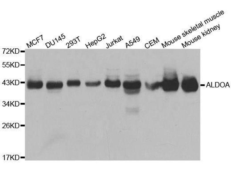 The protein encoded by this gene, Aldolase A (fructose-bisphosphate aldolase), is a glycolytic enzyme that catalyzes the reversible conversion of fructose-1,6-bisphosphate to glyceraldehyde 3-phosphate and dihydroxyacetone phosphate. Three aldolase isozymes (A, B, and C), encoded by three different genes, are differentially expressed during development. Aldolase A is found in the developing embryo and is produced in even greater amounts in adult muscle. Aldolase A expression is repressed in adult liver, kidney and intestine and similar to aldolase C levels in brain and other nervous tissue. Aldolase A deficiency has been associated with myopathy and hemolytic anemia. Alternative splicing and alternative promoter usage results in multiple transcript variants. Related pseudogenes have been identified on chromosomes 3 and 10.,ALDOA,ALDA,GSD12,HEL-S-87p,Cancer,Signal Transduction,Cell Biology & Developmental Biology,Cell Cycle,Centrosome,Endocrine & Metabolism,Amino acid metabolism,Carbohydrate metabolism,ALDOA