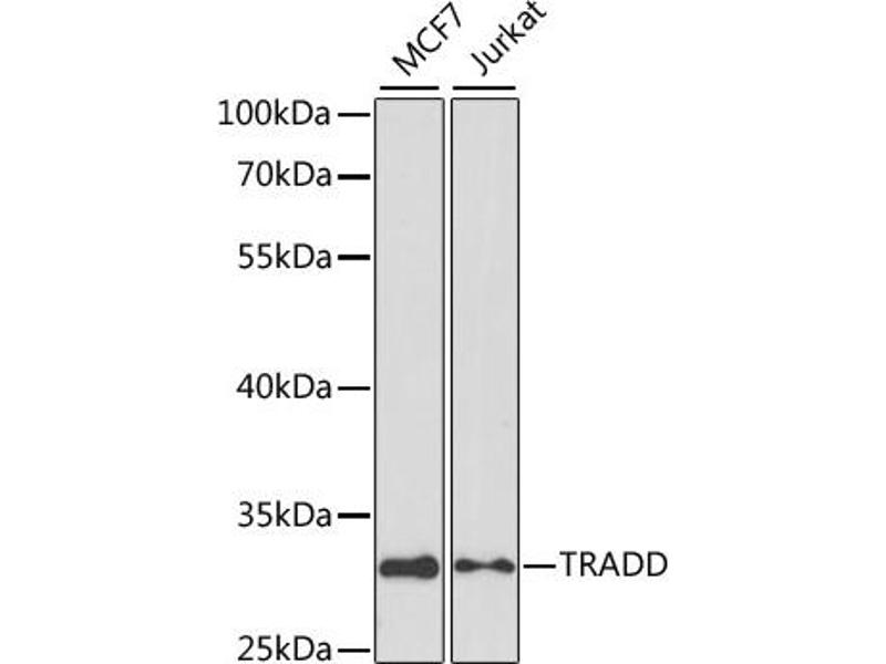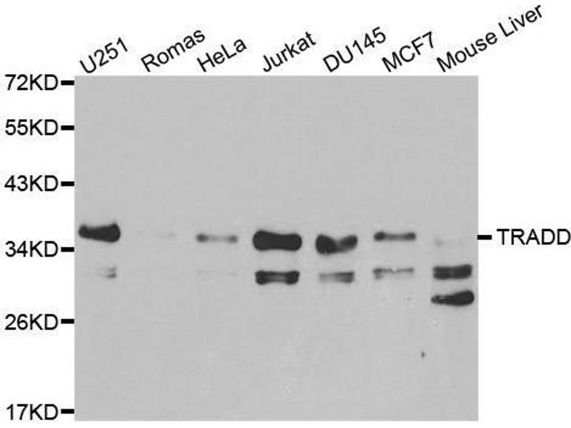 The protein encoded by this gene is a death domain containing adaptor molecule that interacts with TNFRSF1A/TNFR1 and mediates programmed cell death signaling and NF-kappaB activation. This protein binds adaptor protein TRAF2, reduces the recruitment of inhibitor-of-apoptosis proteins (IAPs) by TRAF2, and thus suppresses TRAF2 mediated apoptosis. This protein can also interact with receptor TNFRSF6/FAS and adaptor protein FADD/MORT1, and is involved in the Fas-induced cell death pathway.,TRADD,Hs.89862,Cancer,Invasion and Metastasis,Signal Transduction,MAPK-JNK Signaling Pathway,MAPK-P38 Signaling Pathway,Cell Biology & Developmental Biology,Apoptosis,Death receptors & ligands,Inhibition of Apoptosis,Growth factor,TNF,Death Receptor Signaling Pathway,Immunology & Inflammation,NF-kB Signaling Pathway,Cardiovascular,TRADD
