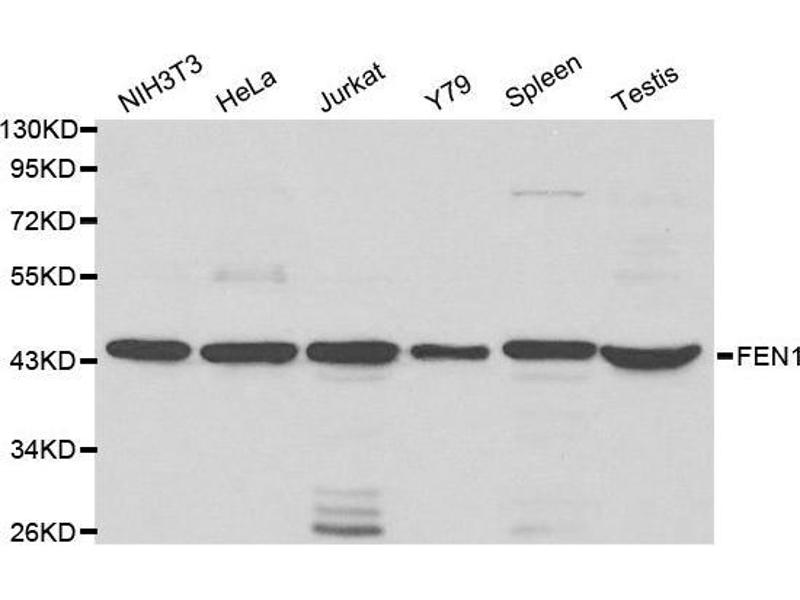 The protein encoded by this gene removes 5' overhanging flaps in DNA repair and processes the 5' ends of Okazaki fragments in lagging strand DNA synthesis. Direct physical interaction between this protein and AP endonuclease 1 during long-patch base excision repair provides coordinated loading of the proteins onto the substrate, thus passing the substrate from one enzyme to another. The protein is a member of the XPG/RAD2 endonuclease family and is one of ten proteins essential for cell-free DNA replication. DNA secondary structure can inhibit flap processing at certain trinucleotide repeats in a length-dependent manner by concealing the 5' end of the flap that is necessary for both binding and cleavage by the protein encoded by this gene. Therefore, secondary structure can deter the protective function of this protein, leading to site-specific trinucleotide expansions.,FEN1,FEN-1,MF1,RAD2,Epigenetics & Nuclear Signaling,DNA Damage & Repair,FEN1