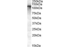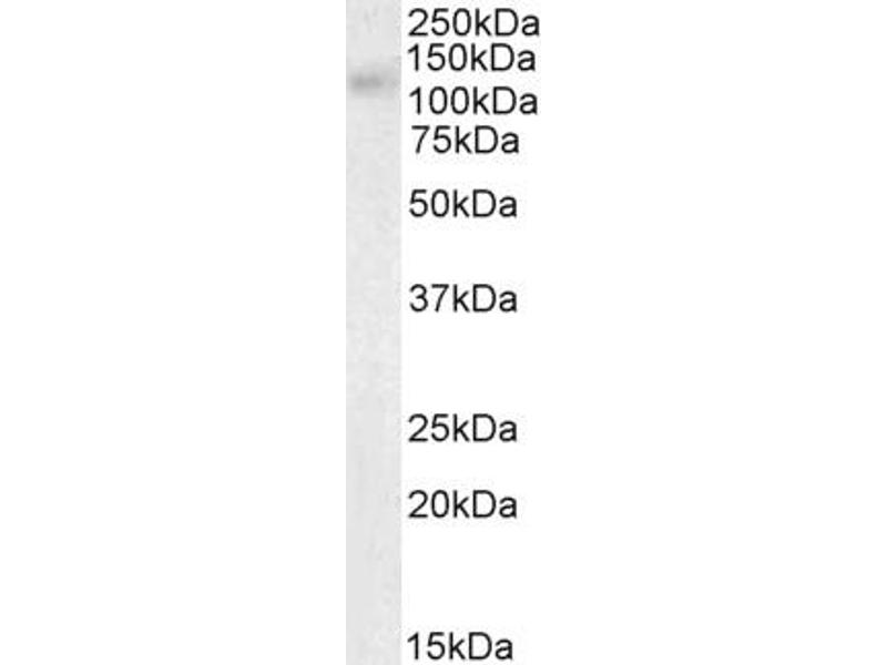 Western Blot: Approx 125 kDa band observed in Human Testis lysates and in preliminary testing of Breast lysate (calculated MW of 150 kDa according to NP_660187.1). This molecular weight is routinely observed by other sources. Recommended concentration: 0.