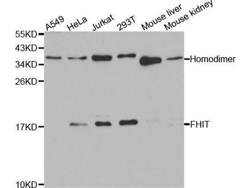 This gene, a member of the histidine triad gene family, encodes a diadenosine 5',5'''-P1,P3-triphosphate hydrolase involved in purine metabolism. The gene encompasses the common fragile site FRA3B on chromosome 3, where carcinogen-induced damage can lead to translocations and aberrant transcripts of this gene. In fact, aberrant transcripts from this gene have been found in about half of all esophageal, stomach, and colon carcinomas. Alternatively spliced transcript variants have been found for this gene.,FHIT,AP3Aase,FRA3B,Epigenetics & Nuclear Signaling,Cancer,Tumor suppressors,FHIT