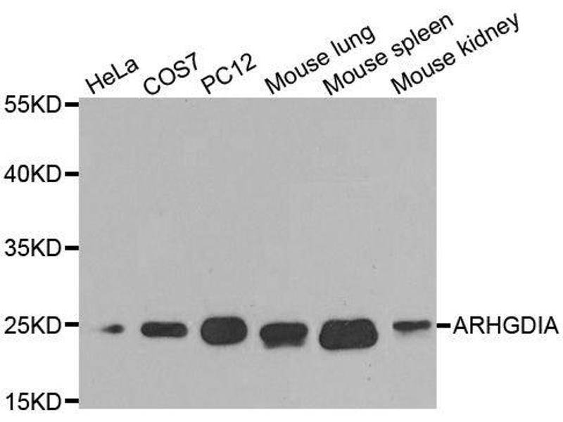 This gene encodes a protein that plays a key role in the regulation of signaling through Rho GTPases. The encoded protein inhibits the disassociation of Rho family members from GDP (guanine diphosphate), thereby maintaining these factors in an inactive state. Activity of this protein is important in a variety of cellular processes, and expression of this gene may be altered in tumors. Mutations in this gene have been found in individuals with nephrotic syndrome, type 8. Alternate splicing results in multiple transcript variants.,ARHGDIA,GDIA1,HEL-S-47e,NPHS8,RHOGDI,RHOGDI-1,Signal Transduction,G protein signaling,Signal Transduction,Cell Biology & Developmental Biology,Cytoskeleton,Extracellular Matrix,ARHGDIA