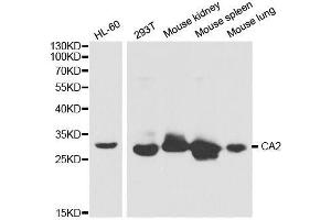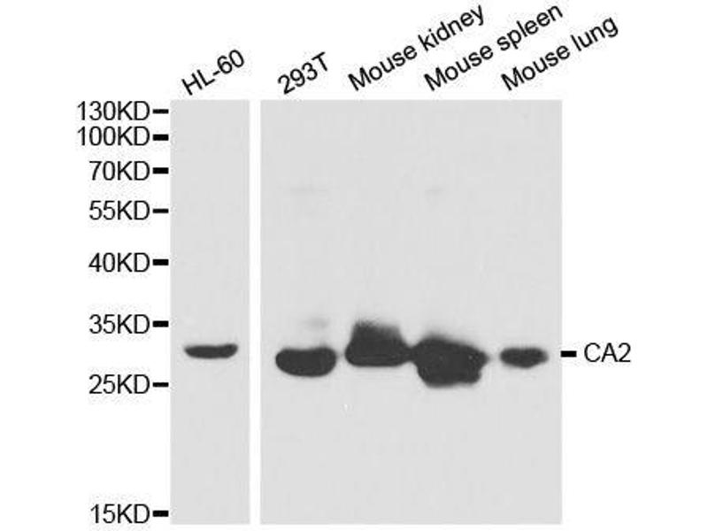 The protein encoded by this gene is one of several isozymes of carbonic anhydrase, which catalyzes reversible hydration of carbon dioxide. Defects in this enzyme are associated with osteopetrosis and renal tubular acidosis. Two transcript variants encoding different isoforms have been found for this gene.,CA2,CA-II,CAC,CAII,Car2,HEL-76,HEL-S-282,Cell Biology & Developmental Biology,Cardiovascular,Blood,CA2