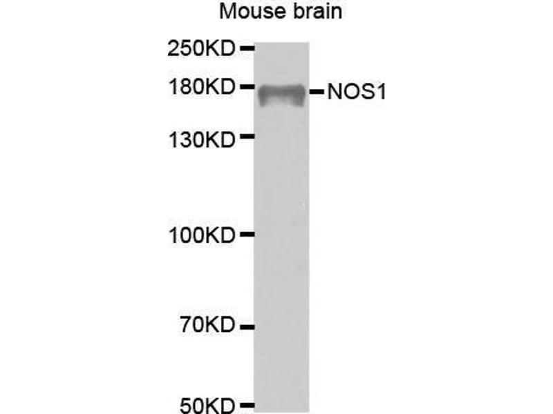 The protein encoded by this gene belongs to the family of nitric oxide synthases, which synthesize nitric oxide from L-arginine. Nitric oxide is a reactive free radical, which acts as a biologic mediator in several processes, including neurotransmission, and antimicrobial and antitumoral activities. In the brain and peripheral nervous system, nitric oxide displays many properties of a neurotransmitter, and has been implicated in neurotoxicity associated with stroke and neurodegenerative diseases, neural regulation of smooth muscle, including peristalsis, and penile erection. This protein is ubiquitously expressed, with high level of expression in skeletal muscle. Multiple transcript variants that differ in the 5' UTR have been described for this gene but the full-length nature of these transcripts is not known. Additionally, alternatively spliced transcript variants encoding different isoforms (some testis-specific) have been found for this gene.,NOS1,IHPS1,N-NOS,NC-NOS,NOS,bNOS,nNOS,Cancer,Signal Transduction,MAPK-Erk Signaling Pathway,Endocrine & Metabolism,Neuroscience,Neurodegenerative Diseases,Cardiovascular,Angiogenesis,NOS1