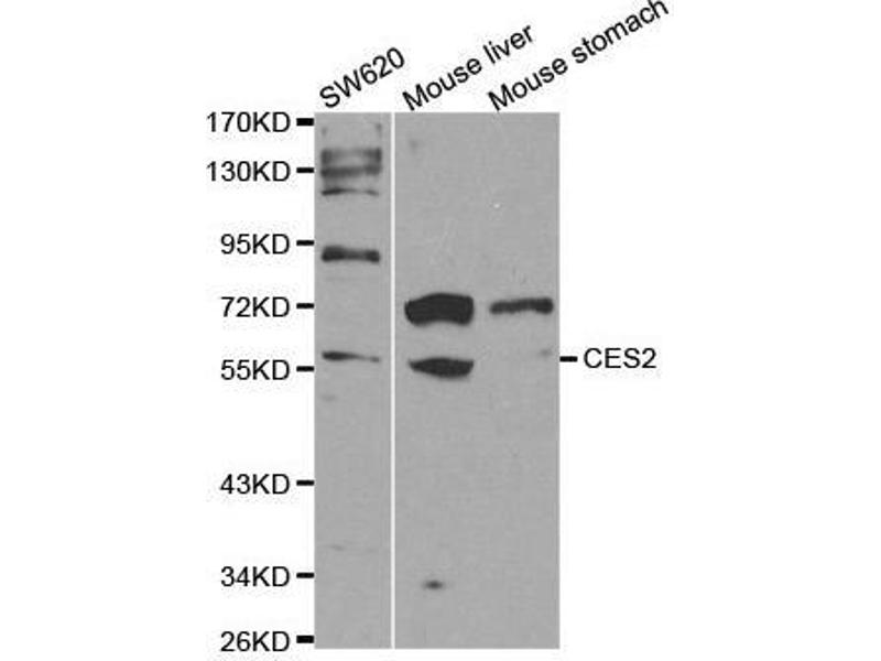 This gene encodes a member of the carboxylesterase large family. The family members are responsible for the hydrolysis or transesterification of various xenobiotics, such as cocaine and heroin, and endogenous substrates with ester, thioester, or amide bonds. They may participate in fatty acyl and cholesterol ester metabolism, and may play a role in the blood-brain barrier system. The protein encoded by this gene is the major intestinal enzyme and functions in intestine drug clearance. Alternatively spliced transcript variants have been found for this gene.,CES2,CE-2,CES2A1,PCE-2,iCE,Signal Transduction,Endocrine & Metabolism,Lipid Metabolism,Drug metabolism,CES2