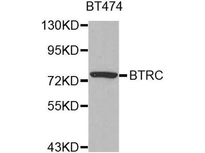 This gene encodes a member of the F-box protein family which is characterized by an approximately 40 amino acid motif, the F-box. The F-box proteins constitute one of the four subunits of ubiquitin protein ligase complex called SCFs (SKP1-cullin-F-box), which function in phosphorylation-dependent ubiquitination. The F-box proteins are divided into 3 classes: Fbws containing WD-40 domains, Fbls containing leucine-rich repeats, and Fbxs containing either different protein-protein interaction modules or no recognizable motifs. The protein encoded by this gene belongs to the Fbws class, in addition to an F-box, this protein contains multiple WD-40 repeats. The encoded protein mediates degradation of CD4 via its interaction with HIV-1 Vpu. It has also been shown to ubiquitinate phosphorylated NFKBIA (nuclear factor of kappa light polypeptide gene enhancer in B-cells inhibitor, alpha), targeting it for degradation and thus activating nuclear factor kappa-B. Alternatively spliced transcript variants have been described. A related pseudogene exists in chromosome 6.,BTRC,BETA-TRCP,FBW1A,FBXW1,FBXW1A,FWD1,bTrCP,bTrCP1,betaTrCP,Beta-TRCP,Signal Transduction,Cell Biology & Developmental Biology,Cell Cycle,Centrosome,Ubiquitin,Ubiquitin-Proteasome Signaling Pathway,Hedgehog Signaling Pathway,Wnt/β-Catenin Signaling Pathway,Immunology & Inflammation,NF-kB Signaling Pathway,Neuroscience,BTRC
