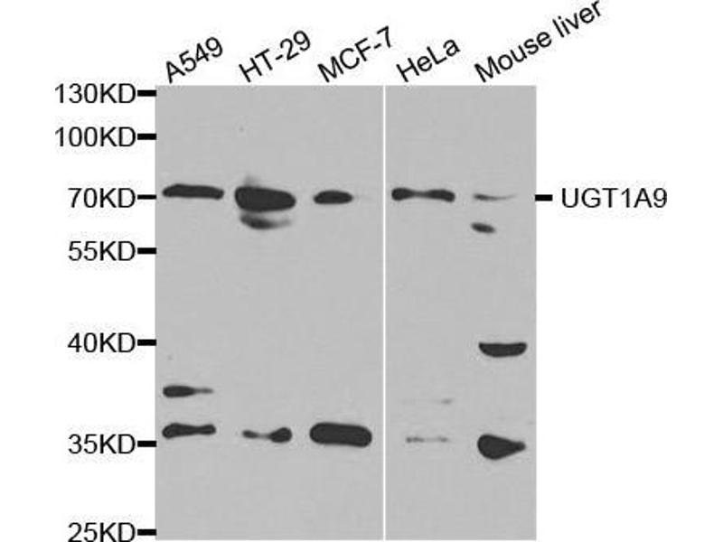 This gene encodes a UDP-glucuronosyltransferase, an enzyme of the glucuronidation pathway that transforms small lipophilic molecules, such as steroids, bilirubin, hormones, and drugs, into water-soluble, excretable metabolites. This gene is part of a complex locus that encodes several UDP-glucuronosyltransferases. The locus includes thirteen unique alternate first exons followed by four common exons. Four of the alternate first exons are considered pseudogenes. Each of the remaining nine 5' exons may be spliced to the four common exons, resulting in nine proteins with different N-termini and identical C-termini. Each first exon encodes the substrate binding site, and is regulated by its own promoter. The enzyme encoded by this gene is active on phenols.,UGT1A9,HLUGP4,LUGP4,UDPGT,UDPGT 1-9,UGT-1I,UGT1-09,UGT1-9,UGT1.9,UGT1A9S,UGT1AI,UGT1I,UDPGT1-9,Cancer,Signal Transduction,Endocrine & Metabolism,Lipid Metabolism,Drug metabolism,UGT1A9